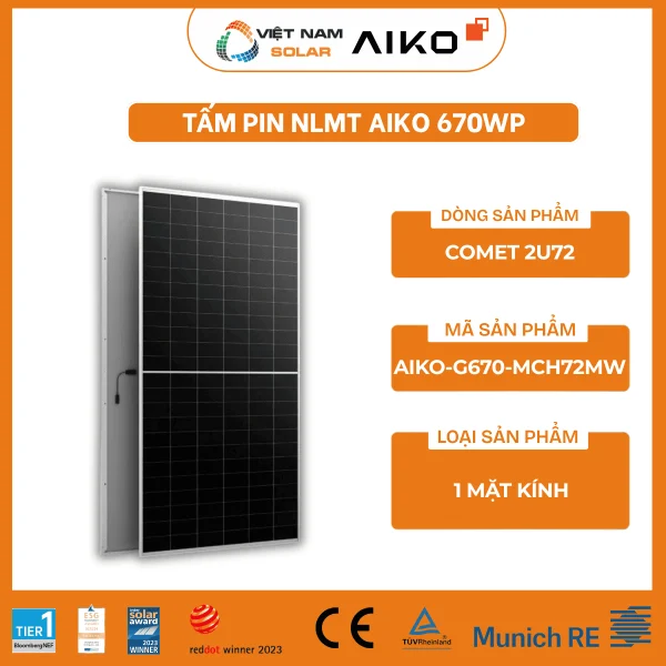 AIKO-G670-MCH72Mw là tấm pin năng lượng mặt trời thuộc dòng COMET 2U Mono-Glass Module, phát triển theo định hướng nâng công suất trên mỗi mô-đun, tối ưu hiệu suất vận hành và hỗ trợ hệ thống làm việc ổn định trong thời gian dài.