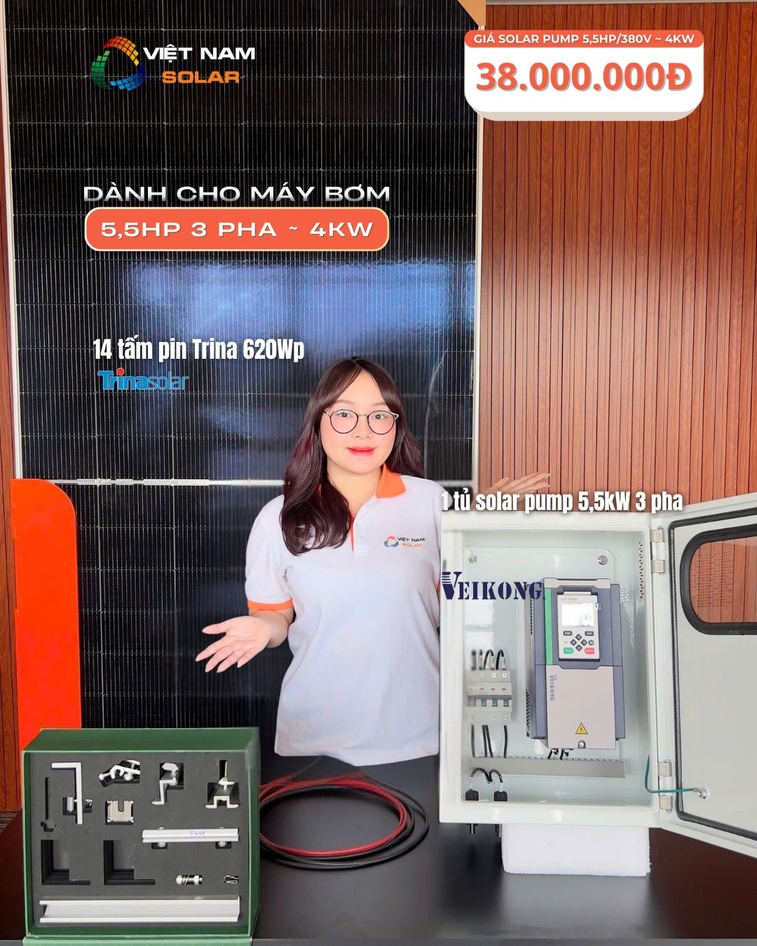 - Cấu hình đồng bộ: tấm pin Trina, tủ Solar Pump Veikong, dây – phụ kiện tiêu chuẩn, đầy đủ tài liệu kỹ thuật.